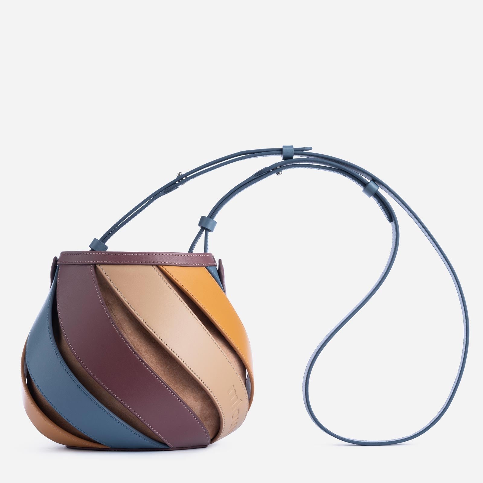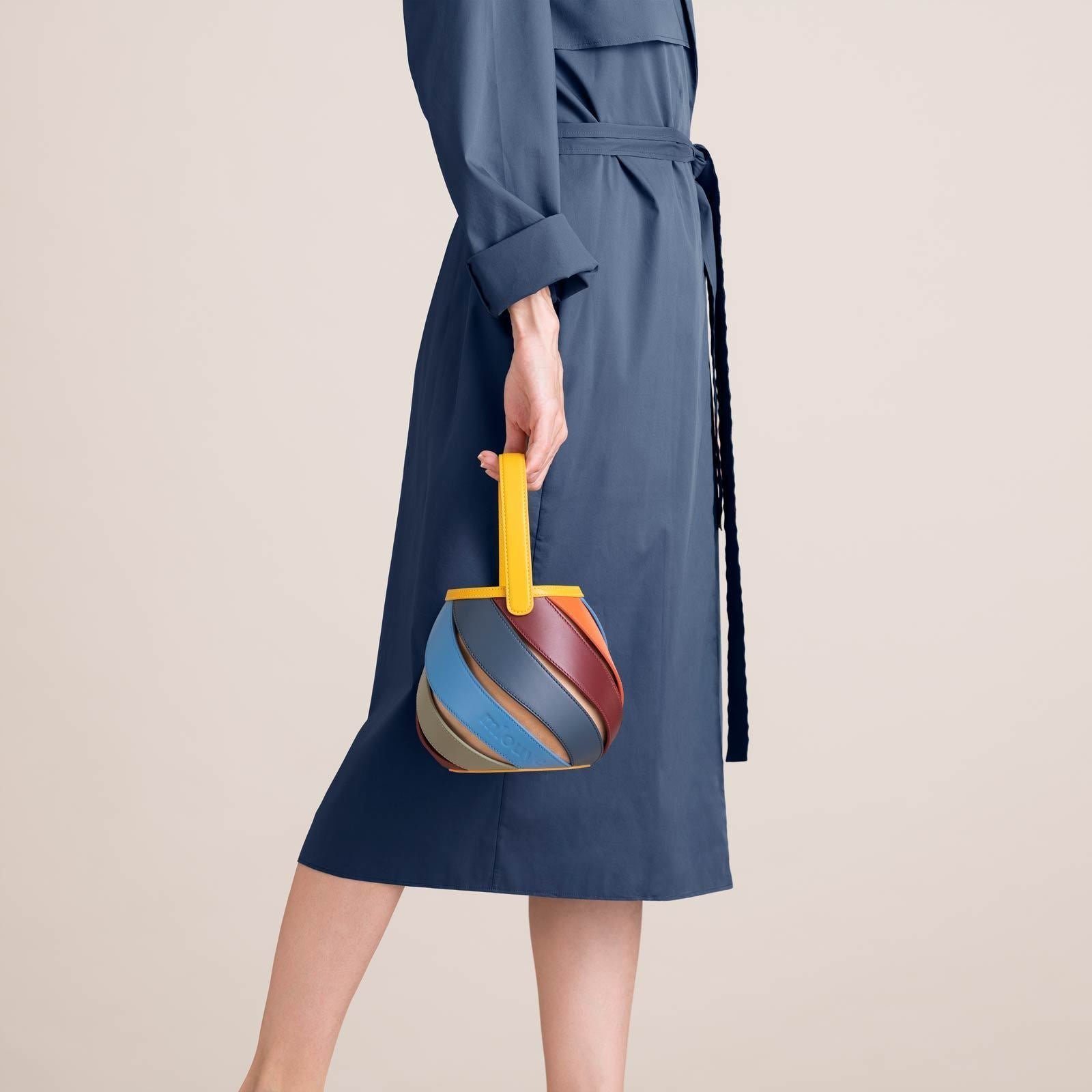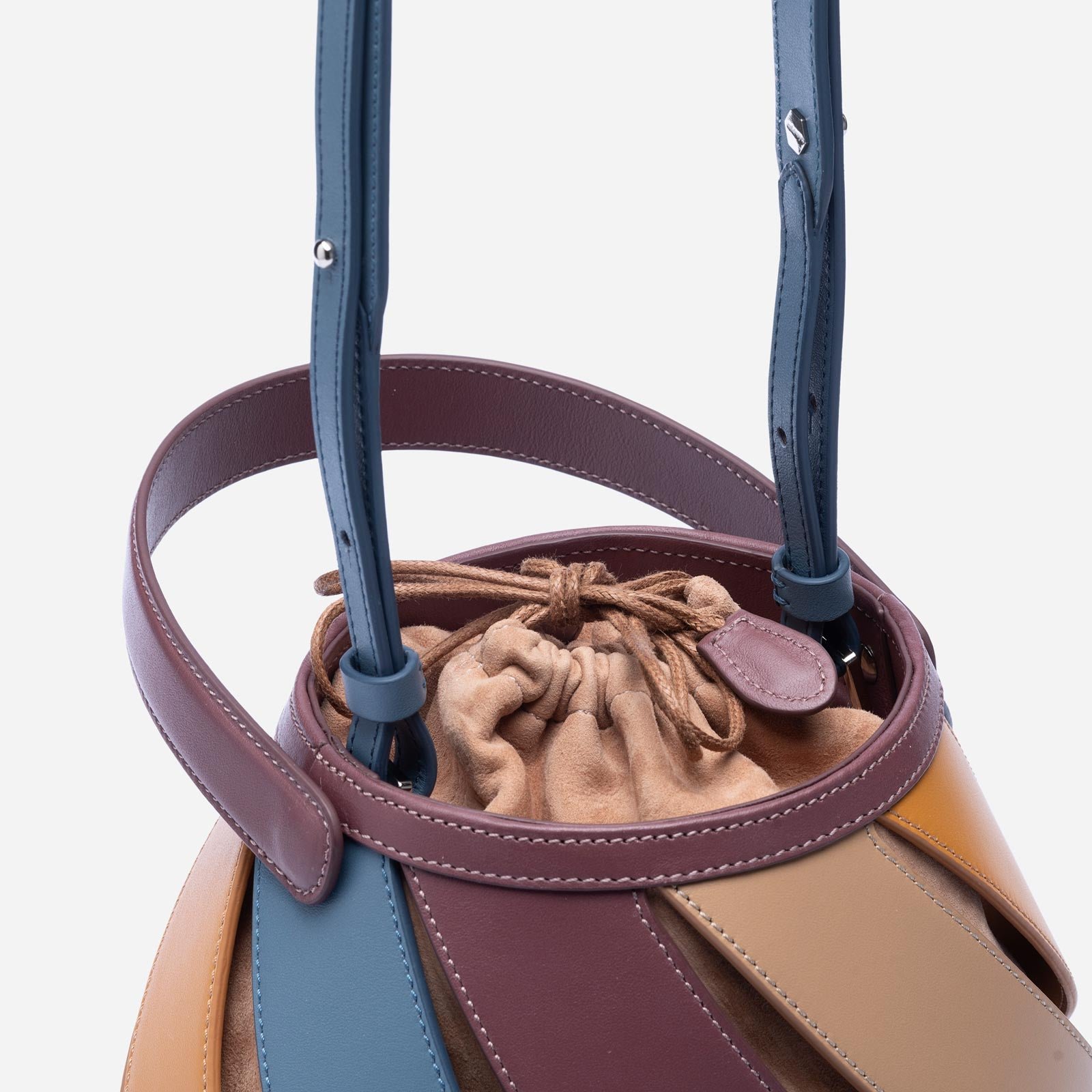 Featuring a unique combination of modern art and minimalist perspective. our Helix Bag is perfectly sized to fit just the essentials – think small wallet. keys. sunglasses and large phone. It has a wind spinner silhouette that will remind you summer breezes out on the porch. The top handle is cleverly linked to the body through its hidden joint; it can fall down when you use the bag with shoulder strap. Made from smooth leather and has a suede internal with a drawstring top to keep all you have stowed inside safe and secure.