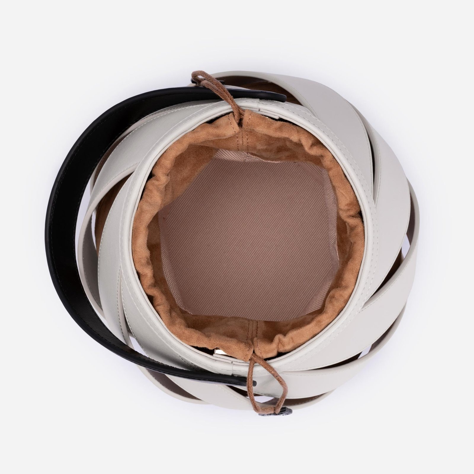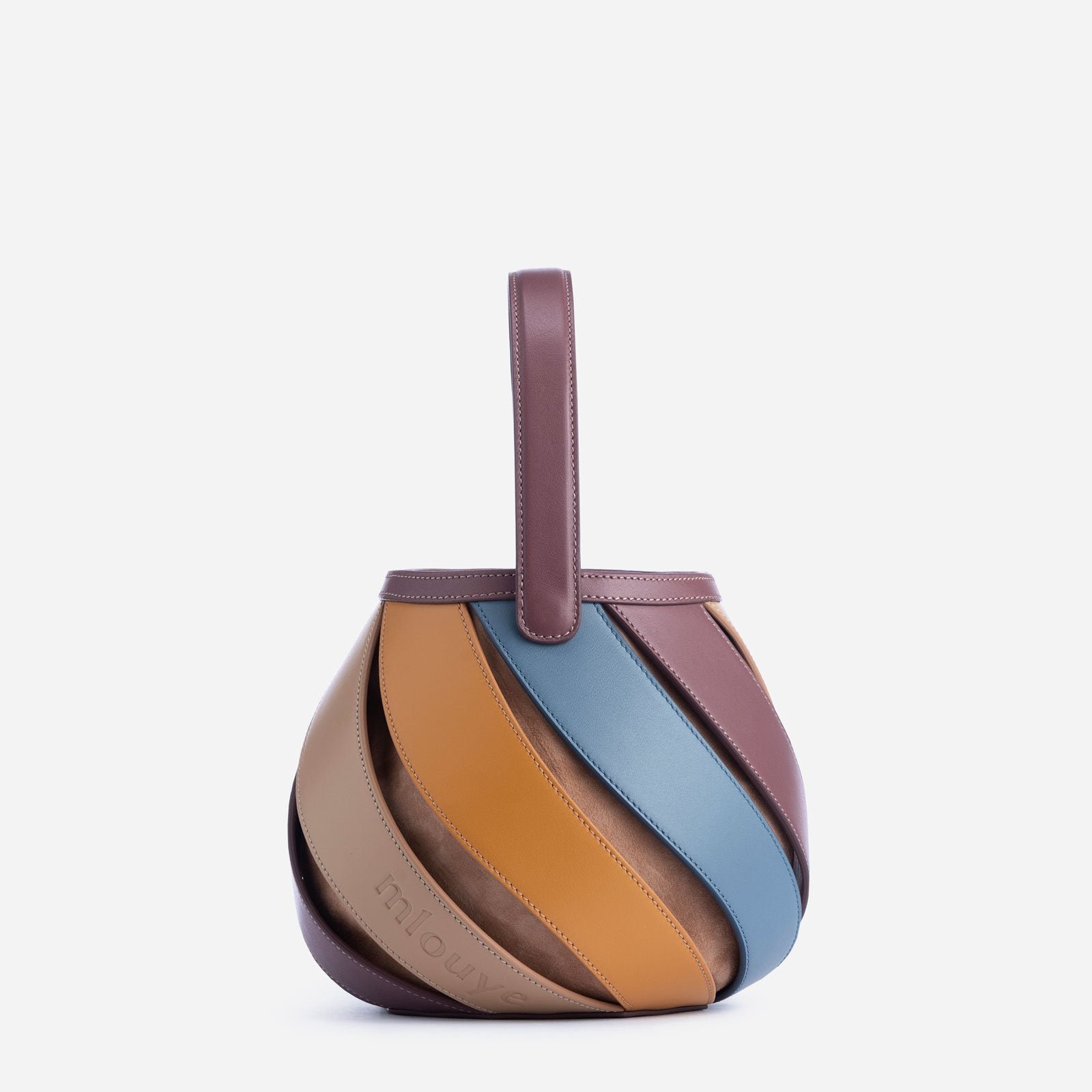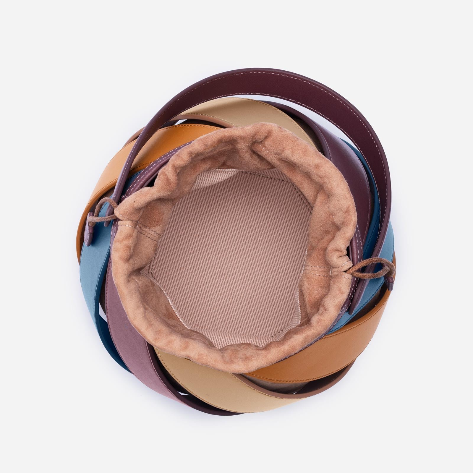 Featuring a unique combination of modern art and minimalist perspective. our Helix Bag is perfectly sized to fit just the essentials – think small wallet. keys. sunglasses and large phone. It has a wind spinner silhouette that will remind you summer breezes out on the porch. The top handle is cleverly linked to the body through its hidden joint; it can fall down when you use the bag with shoulder strap. Made from smooth leather and has a suede internal with a drawstring top to keep all you have stowed inside safe and secure.