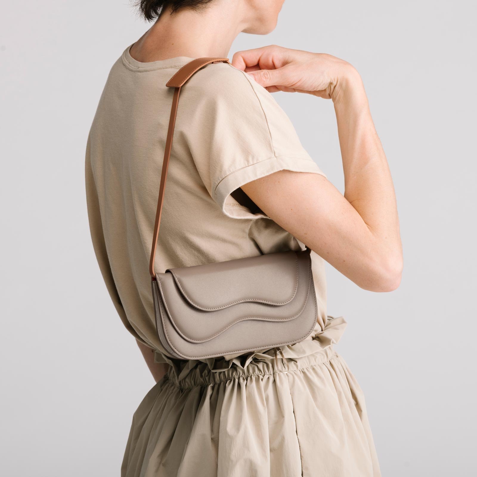 The Wave Wallet. a wallet-turned-shoulder-bag. The Wave Wallet features two conjoined leather flaps that open to reveal space for all your financial essentials. A leather divider creates two compartments. with one side for notes and cards. and the other large enough to fit the iPhone Max. and your passport. Spacious enough to hold more than your usual coin purse. yet compact enough for you to locate your metro card lickity-split. Wave Wallet is as utilitarian as it is covetable.